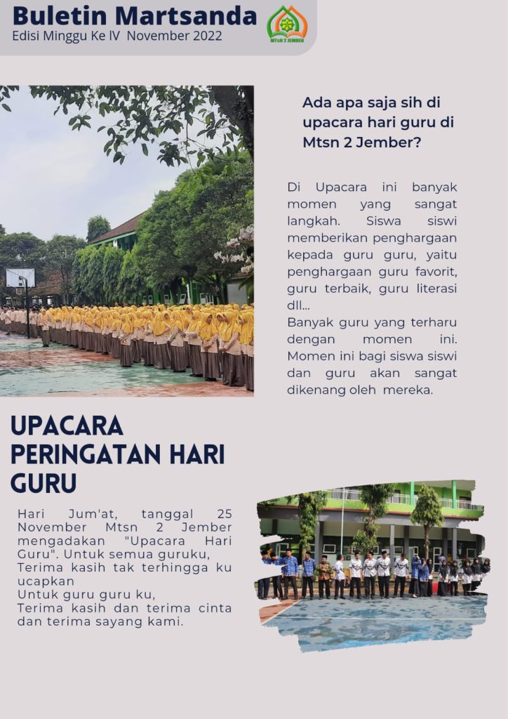 Sebagai salah satu bagian dari dunia pendidikan, MTs Negeri 2 Jember pun tak ketinggalan ikut memeriahkan Hari Guru. Diawali dengan apel pagi, kemudian dilanjutkan dengan acara pemberian ucapan dan cinderamata dari siswa kepada guru-gurunya. Pada sesi apel pagi juga diserahkan sertifikat penghargaan dari madrasah kepada guru-guru yang berprestasi dengan berbagai kategori.