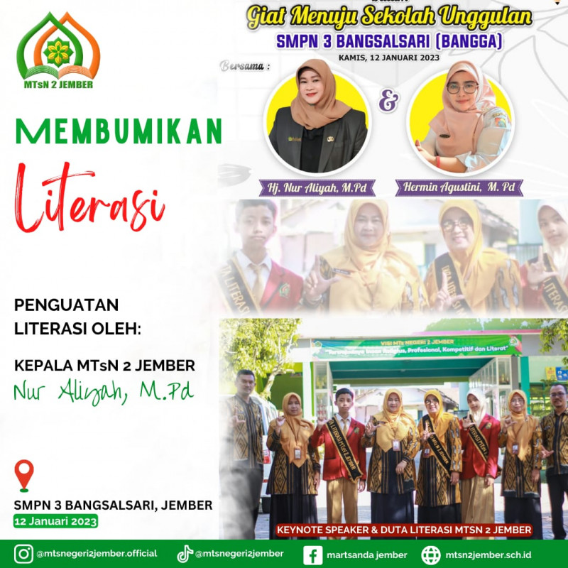Kemesraan dua Srikandi Literasi ini membuktikan betapa besarnya kecintaan mereka terhadap dunia literasi. Kesuksesan yang telah diraih oleh MTs Negeri 2 Jember diharapkan dapat menjadi cikal bakal bangkitnya Gerakan Literasi di Jember. Semoga dengan tulisan ini, para Penggiat Literasi di Jember semakin tertantang untuk terus bergandeng tangan dalam menebarkan virus-virus literasi di bumi Jember tercinta. Sudah saatnya Jember menjadi Kota Literasi Tingkat Nasional. Semangat!