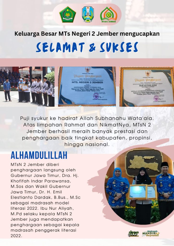Pencapaian sebagai Kepala Madrasah Penggiat Literasi 2022 dan sukses mengantarkan MTsN 2 Jember sebagai Madrasah Model Literasi 2022 mendapat apresiasi dari orang nomor satu di Jatim.