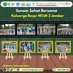 “Senam dan sarapan bersama adalah program rutin setiap bulan. Kegiatan ini merupakan bentuk kerja sama UKS dan Dinas Kesehatan.” Demikian penjelasan Kepala MTs Negeri 2 Jember, yang disampaikan pada pembukaan Sarapan Sehat Bersama, pada Rabu, 17 Januari 2024.